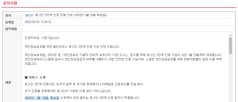 3월 29일부터 11번가측에서 2단계인증을 실행한다는 공지가 올라왔습니다.