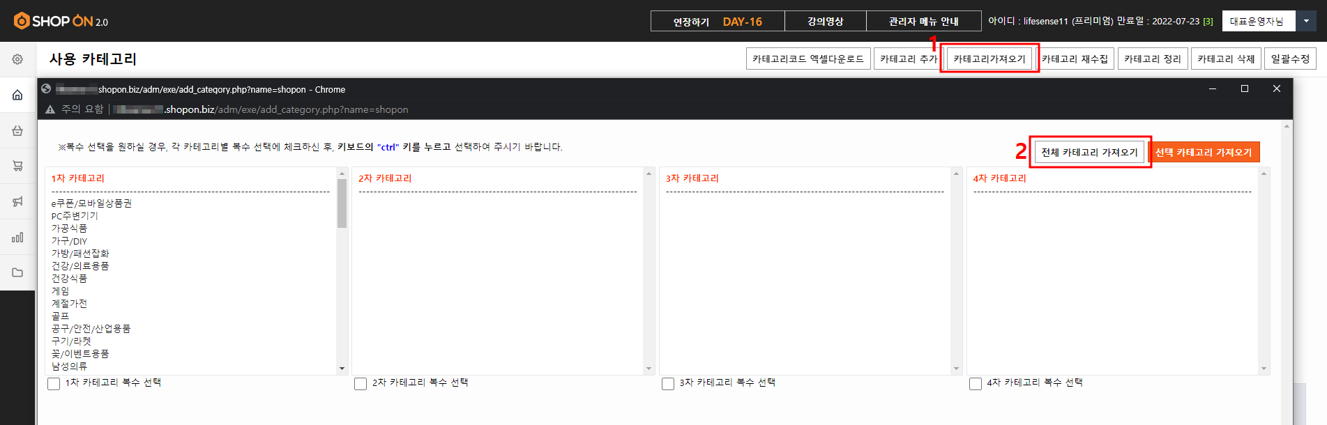 현재는 매핑을 모두 완료하였으며, '카테고리 관리 > 오픈마켓 카테고리 관리 > [카테고리가져오기] > [전체카테고리 가져오기]'버튼을 눌러주신 후